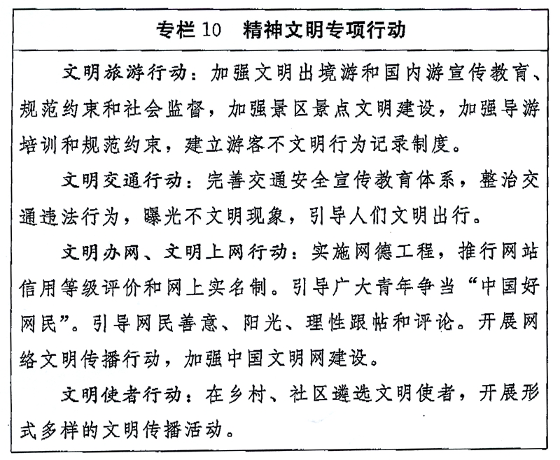 (四)深化拓展群众性精神文明创建活动。广泛开展群众性精神文明创建活动,修订完善各类创建测评体系。加强和改进文明城市创建管理,培育城市精神。加强农村精神文明建设。加强文明行业文明单位创建。培育优良家风家教,传承优良校风校训。针对群众反映强烈的突出问题,开展专项文明行动。完善文化科技卫生“三下乡”长效机制。倡导文明健康生活方式。制定国家礼仪规程。实施全民文明礼仪教育养成行动,培育文明行为习惯。规范升国旗仪式、成人仪式、入党入团入队仪式等礼仪制度。广泛开展军民警民共建精神文明活动。落实党和国家有关政策规定,加强对各类评比活动的规范管理。