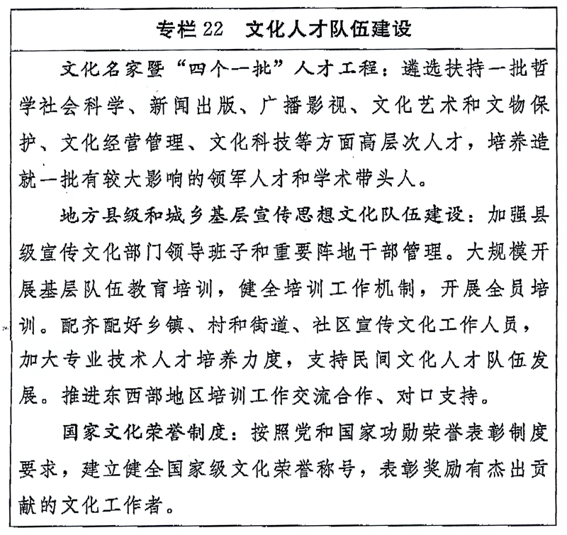 (二)培养造就高层次人才。加强领军人才建设,建立健全重大文化项目首席专家制度,培养集聚一批有深厚马克思主义理论素养、学贯中西的思想家和理论家,造就一批人民喜爱、有国际影响的学术大家、艺术大师和民族文化代表人物。加强新闻出版传媒领域高层次人才培养。实施中国特色新型智库高端人才培养计划,壮大公共政策研究和决策咨询队伍。加强文化产业投资运营、文化企业管理、媒体融合发展、网络信息服务等方面复合型人才、紧缺人才培养,多渠道引进海外优秀文化人才。
